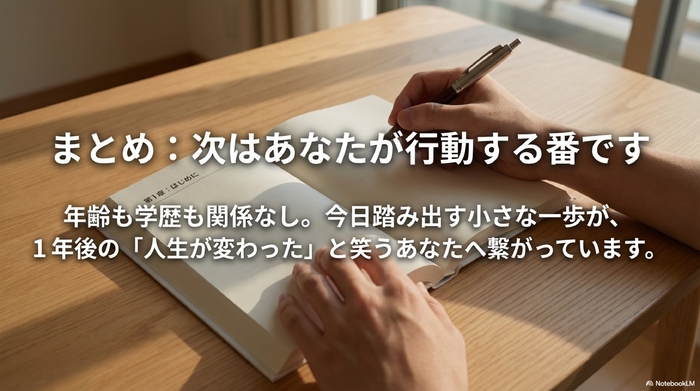 「自分にできるかな」と迷っている間にも、時間は過ぎていきます。まずは書店でテキストを手に取る、資料請求をしてみるなど、小さな一歩で構いません。今日踏み出すその一歩が、半年後の合格、そして1年後に「人生が変わった」と笑っている未来へと確実に繋がっています。次は、あなたが行動する番です。